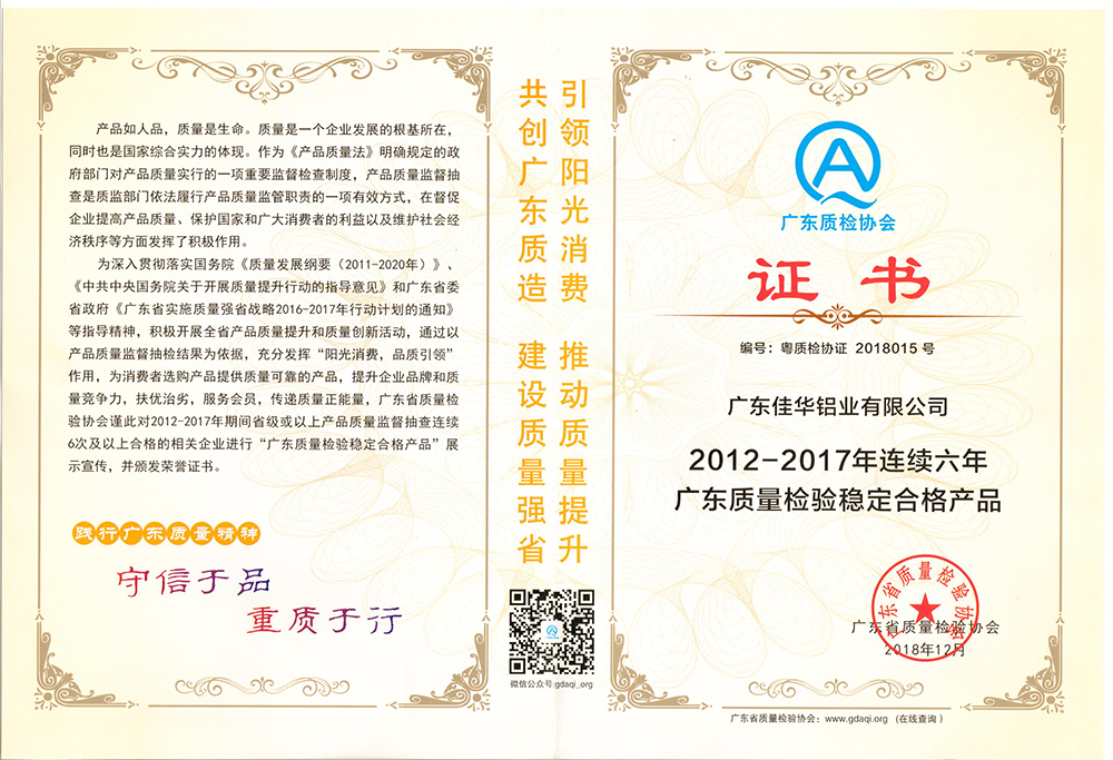 2018年12月,佳華鋁業再次榮獲“2012-2017年連續六年廣東質量檢驗穩定合格產品”證書,體現了行業對于佳華鋁業產品質量的認可。